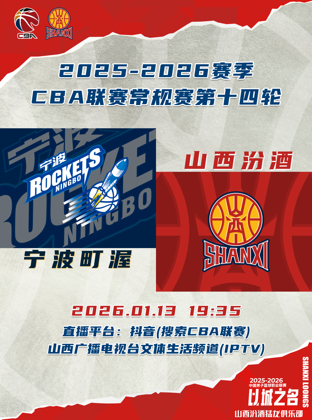 北京时间2026年1月13日19:35,2025-2026赛季CBA联赛常规赛第14轮继续进行,山西汾酒客场挑战宁波町渥,球迷观众可以通过抖音(搜索CBA联赛)、山西广播电视台文体生活频道(IPTV)观看比赛实况,在屏幕前与我们一起为山西汾酒男篮加油助威!